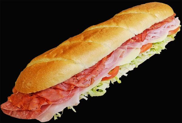 Long sub sandwich with layers of ham, salami, lettuce, tomatoes, and cheese on a crusty baguette