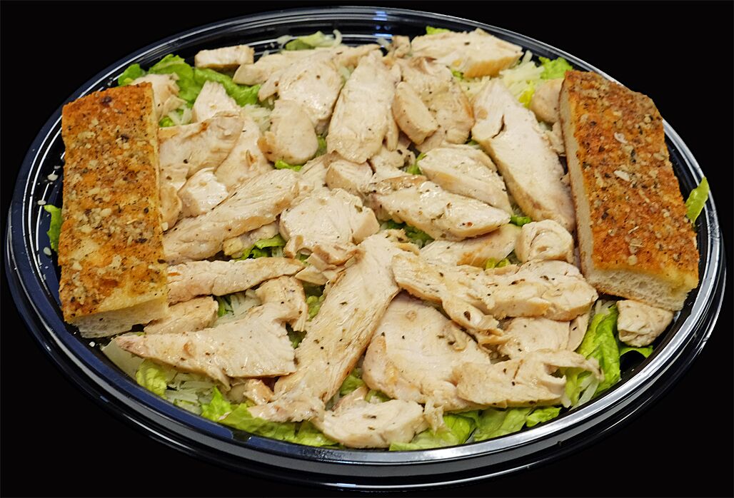Fresh Romaine Lettuce, Parmesan Cheese, Bread Stix And Croutons. Then We Top It With Sliced Grilled Chicken.