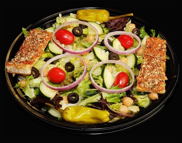 Our Own Lettuce Blend Topped With Tomatoes, Cucumbers, Chick Peas, Black Olives, Pepperoncini And Onion.