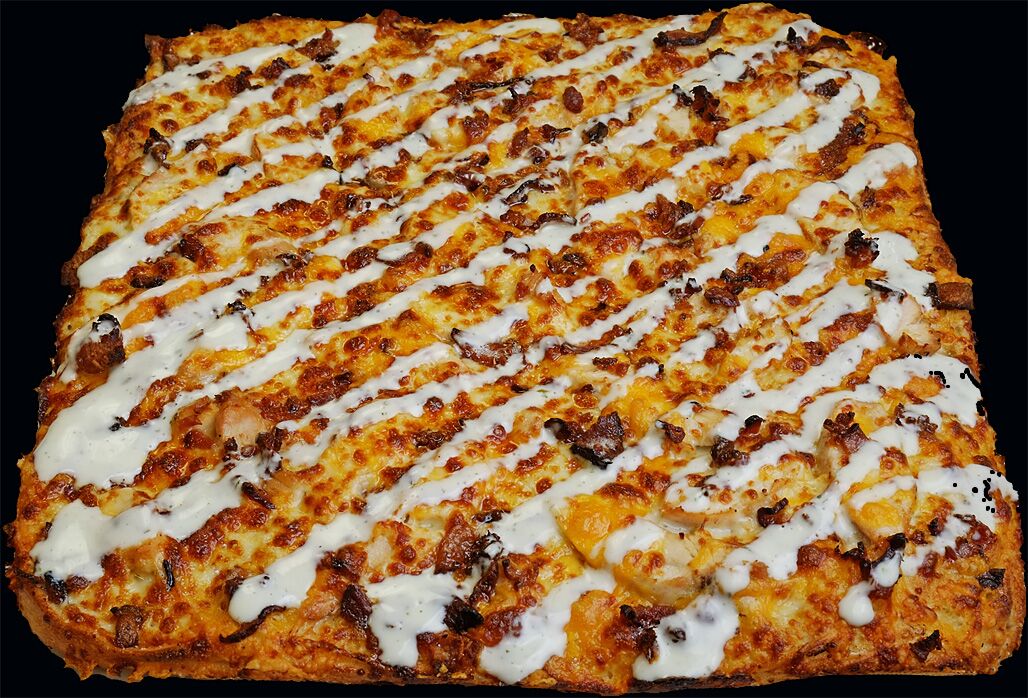 Ranch Dressing base, Grilled Chicken, Mozzarella and Cheddar topped with Crispy Baconn