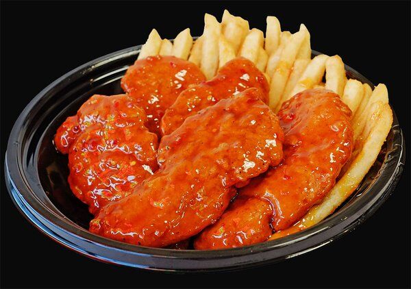 Sauces: Hot, medium, mild, garlic parmesan, BBQ, hot BBQ, honey mustard BBQ, extra hot, dry rub cajun, lemon pepper, kickin’ bourbon, hot honey BBQ.
