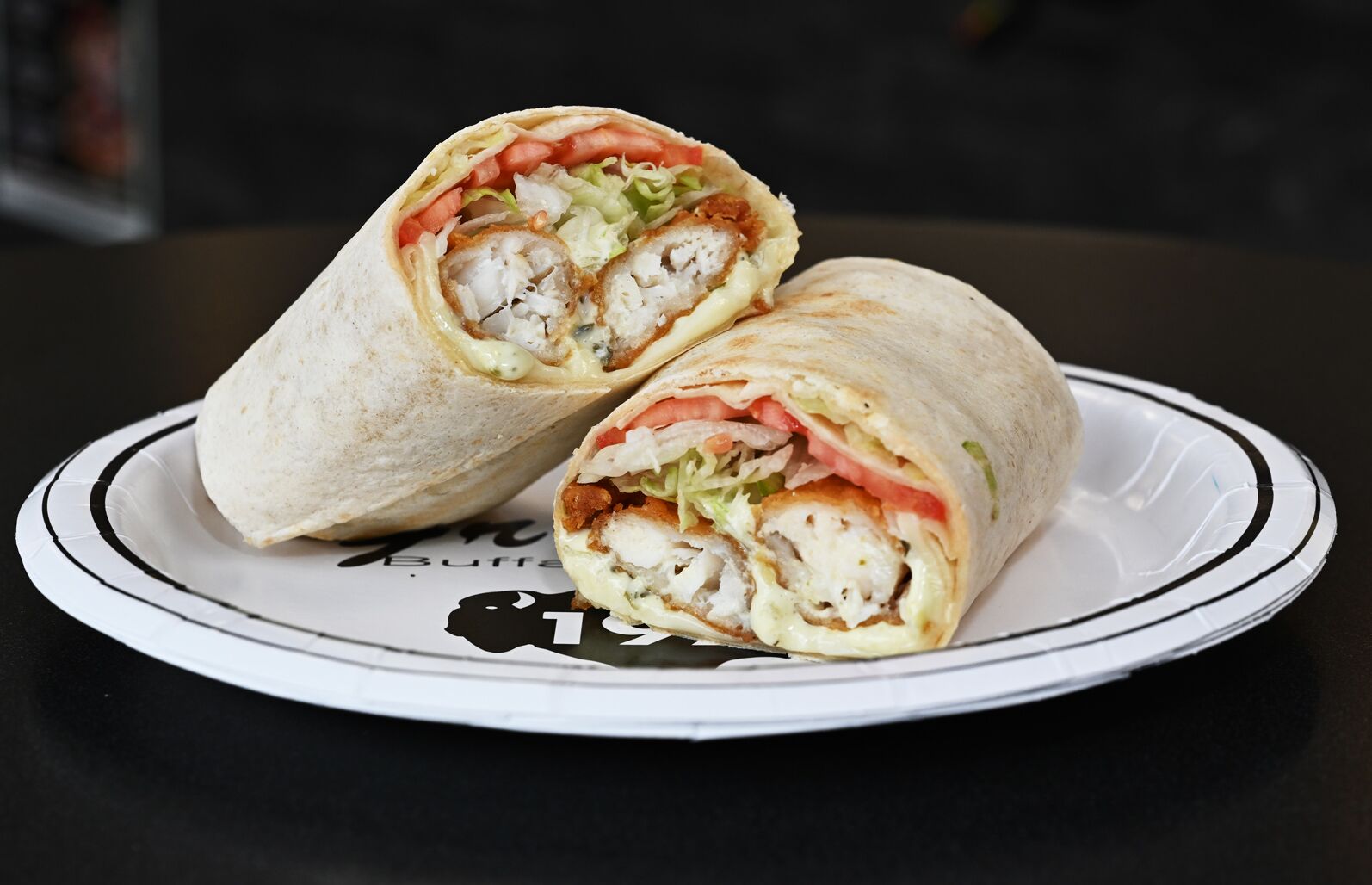 Beer Battered Haddock Tenders, Lettuce, Tomato, Cheese and Tartar Sauce on a White Wheat Wrap