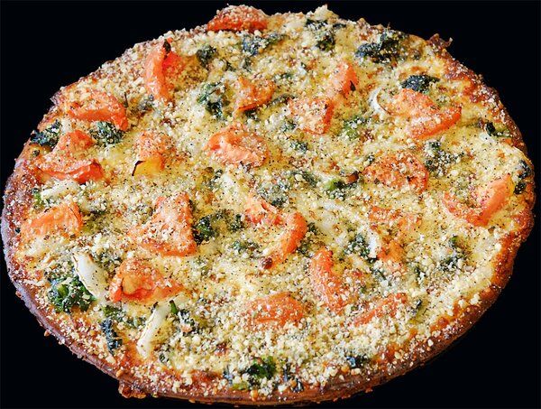 14″ GF cauliflower crust cut into 8 slices. Price is for traditional cheese. Additional charge for Gourmet Varieties.