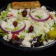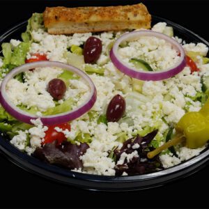 Grilled Chicken Strips, Tomatoes, Cucumbers, Pepperoncini, Chick Peas, Whole Black Olives And Onion.
