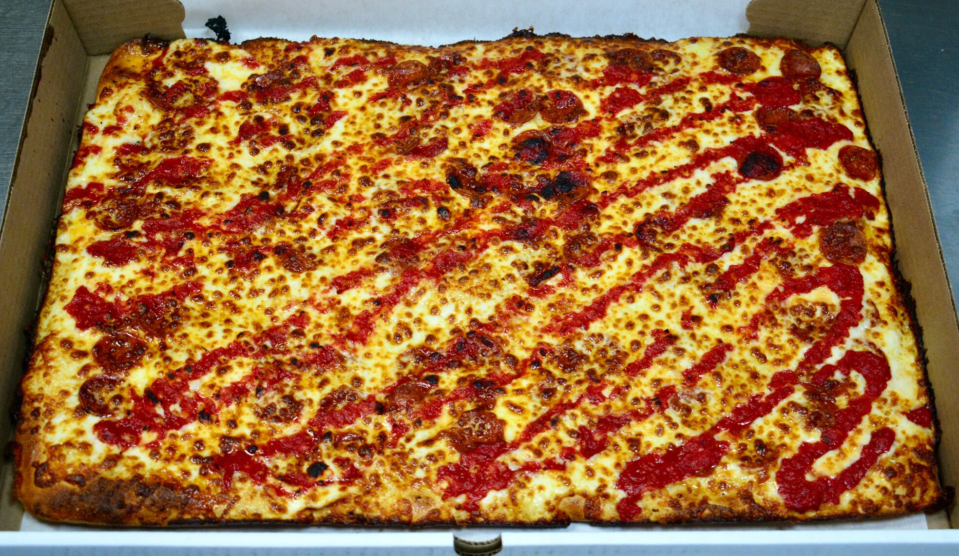 Garlic Sauce on the bottom, Mozzarella, Pepperoni, More Mozzarella and topped with Pizza Sauce.