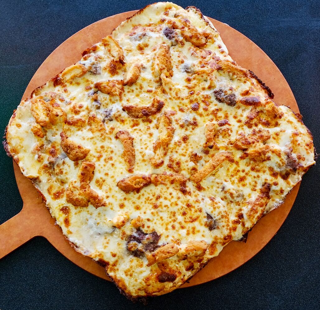 Starting with Franco’s Famous Steak Sauce we add a layer of American Cheese, Sliced Steak, Medium Sauced Chicken Fingers and then top it all off with a layer of Mozzarella.