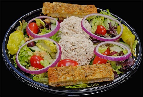 Our Own Lettuce Blend Topped With White Albacore Tuna, Tomatoes, Cucumbers, Chick Peas, Black Olives, Pepperoncini And Onion.